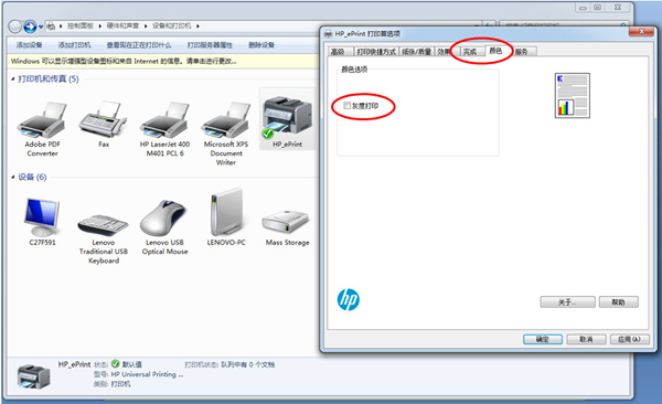 4、安装结束后,默认打印模式为黑白、单面,用户可根据自己的需求修改设置。在“HP_ePrint”上点击右键,在“打印首选项”中进行修改,其中“颜色”页中可设置彩色/灰度打印,在“完成”页中修改单/双面打印模式(图2)。